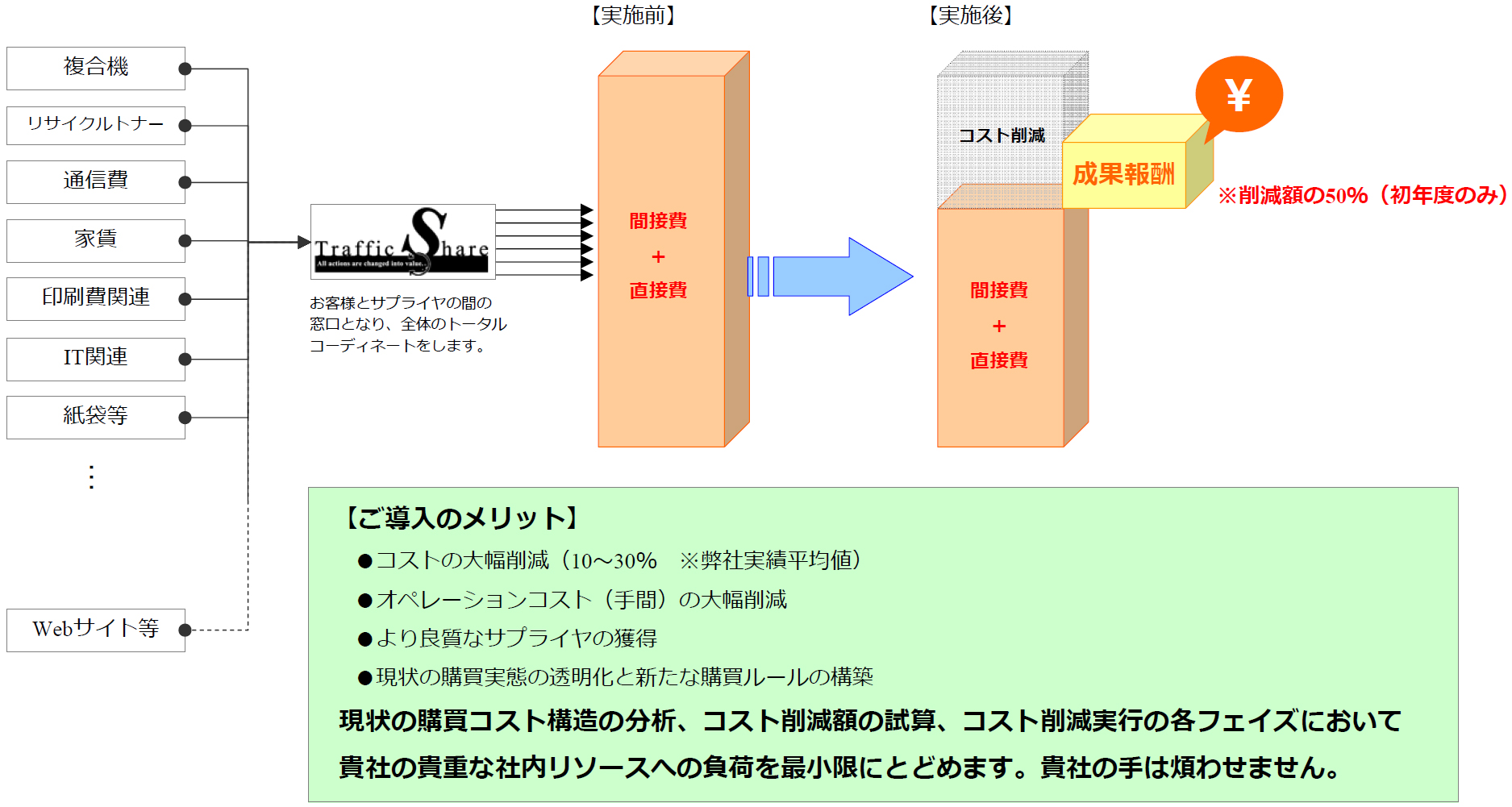 弊社のコスト削減コンサルティングの特徴は、削減したコスト削減額から50%のみ報酬をいただく出来高払いの仕組みを取り入れているところです。コスト削減を目的とした既存のコンサルティングサービスが必要とした初期投資を一切必要としないため、クライアント様は金銭的リスクを一切背負うことなくコスト削減を図ることができます。
